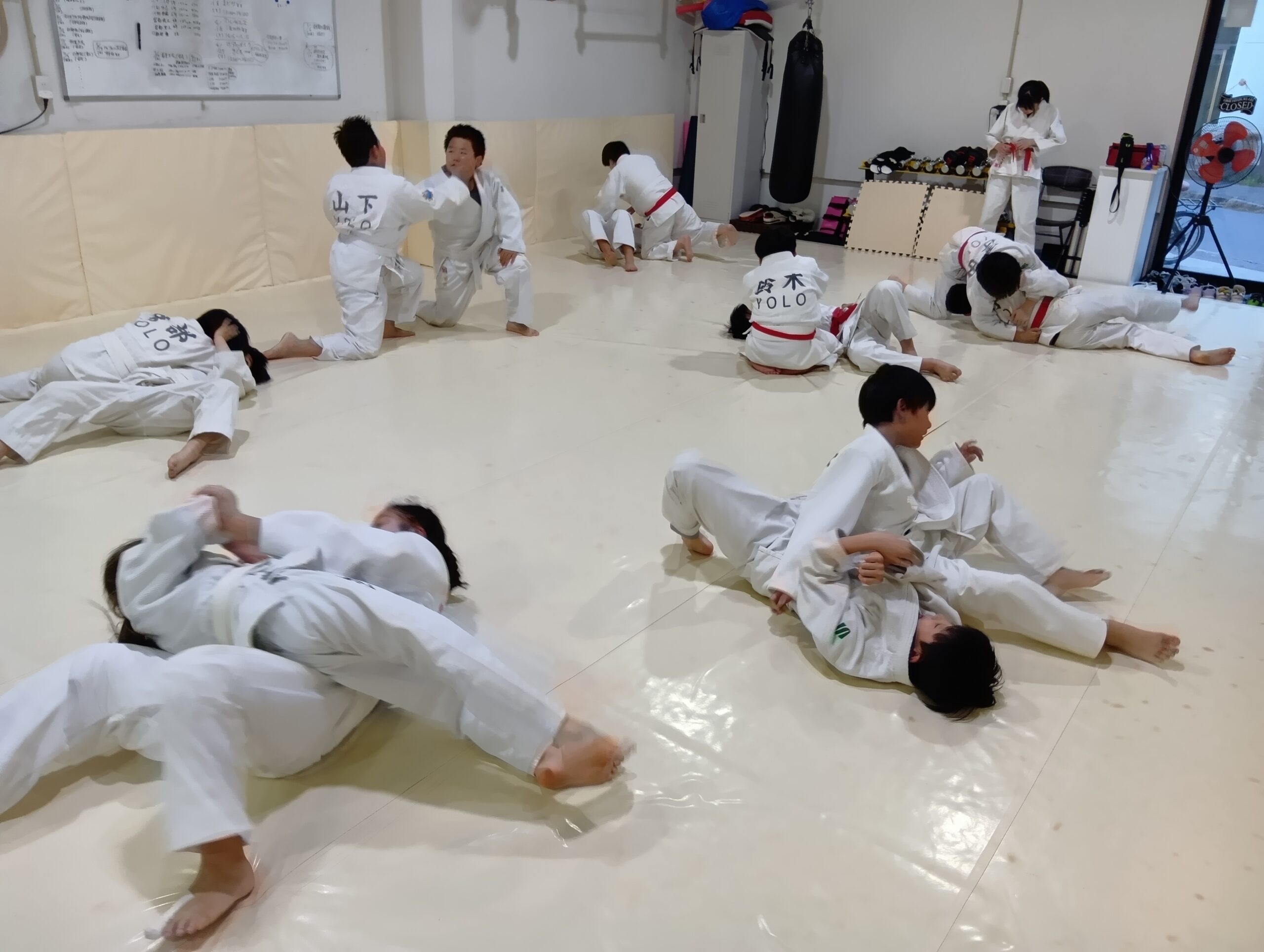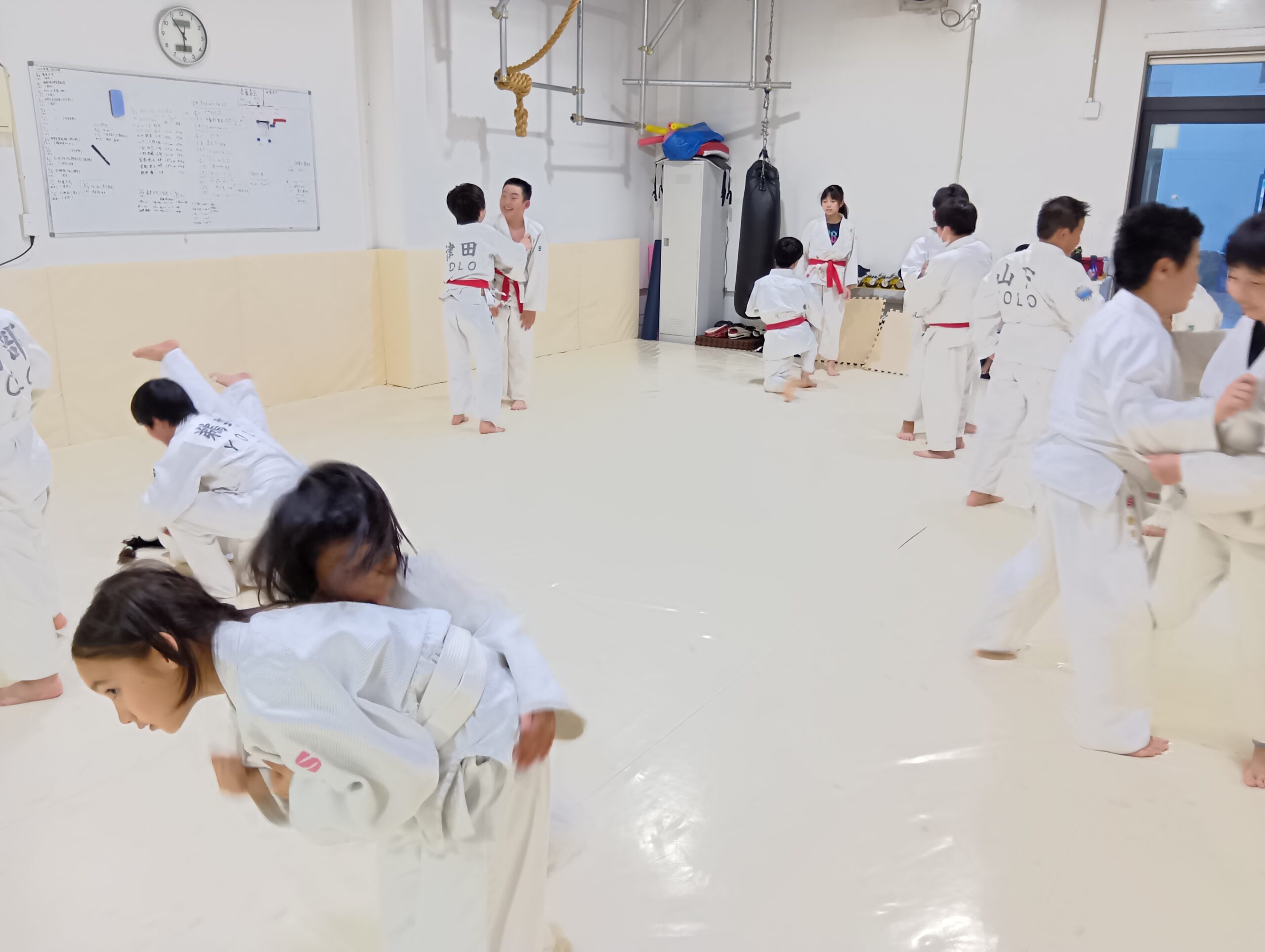 回転運動、補強運動、1人打ち込み、寝技回り打ち込み、寝技乱取り2分×4本。